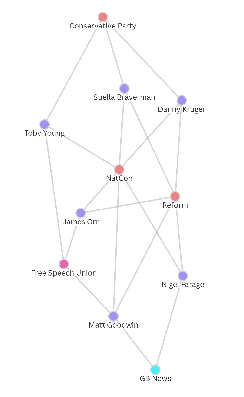 A network mapping exercise on Reform and the Free Speech Union, with Epstein, Thiel and Bannon.