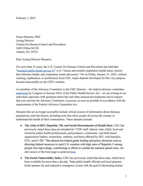 Letter from the Advisory Committee to the acting CDC director Monarez requesting more information regarding the removal of specific datasets from the CDC website (Atlas of HIV, hepatitis, TB, social determinants of Health data, Social Vulnerability Index, Environmental Justice Index, Youth Risk Factor Behavioral Surveillance System,… Read more