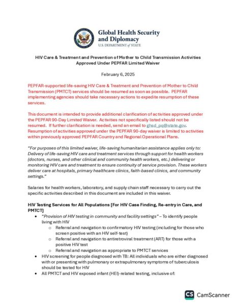 PEPFAR limited waiver document from Feb. 6, 2025 shared by DPH Infectious Disease Committee