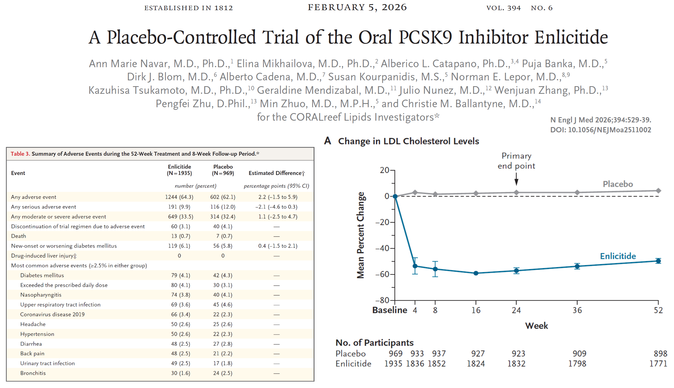 CORALreef Lipids Trial of Enlicitide an Oral PCSK-9 Inhibitor Demonstrates Substantial Efficacyby Peter A. McCullough, MD, MPH on February 9, 2026 at 2:37 pm
